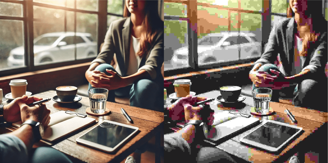 If you compress something a lot it can become lossy, this means that it loses some information in the process. You can think of this as removing pixels or reducing the number colours in an image. If you compress something a little bit, you may get some blurry colours but the overall understanding of the image is there. But if you compress it too much you may loose important information that is important to be conveyed by the image. The image below shows a good understanding that a meeting is taking place with coffee, but in the compressed image its difficult to know whats going on behind the car. This may or may not be important depending on what you are using the image for.