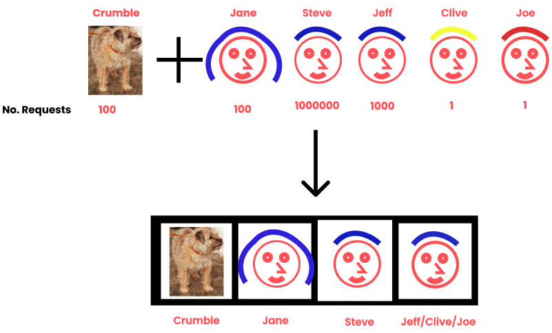 Steve is super popular with 1 million requests a day, with Jeff running up with 1 thousand requests. Jane and crumble are new so they only get 100 requests a day, with Clive and Steve not being very popular with only 1 request per day.